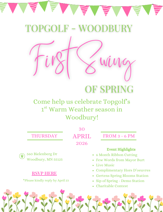 Back to All Events First Swing OF SPRING Thursday, April 30, 2026 3:00 PM 6:00 PM Topgolf Woodbury 560 Bielenberg Drive Woodbury, MN, 55125 United States (map) Google Calendar ICS Join us for the "First Swing of Spring” at Woodbury’s newest fun place to hang out… Topgolf! Proceeds from their event will benefit the Woodbury K9 Fund. Register here.We will be there to welcome participants and to recruit new Board Members. Click here for the application.